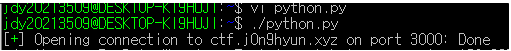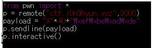 p = remote("ctf.j0n9hyun.xyz",3000) // 문제에서 주어진 정보에 접속