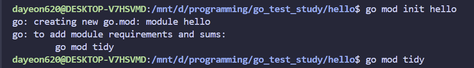 ⇒ 다음과 같이 go.mod 파일이 생긴 것을 볼 수 있다. 이제 go test 혹은 go build가 가능할 것이다.