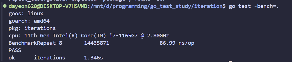 - 성능측정을 하기 위해서 go test -bench=.를 한다 (혹시 Windows Powershell이라면 go test -bench="." 한다)
