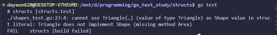 구조체만 만들고 테스트를 진행하면 Area() 메서드에 삼각형이 없기 때문에 오류가 나온다. 따라서 메서드를 추가해 보자.