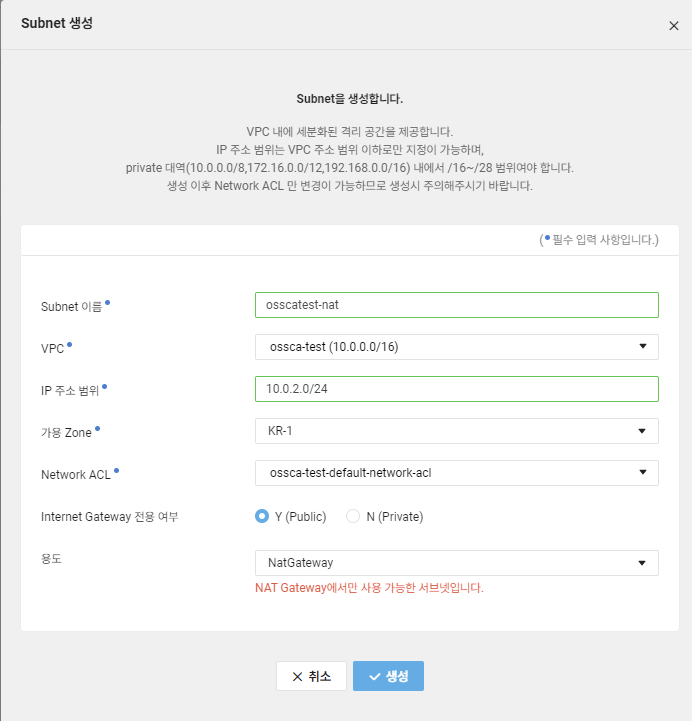 이전에 만든 ACL을 설정하고, Gateway 여부에 Y(Public)을 선택하여 Public Subnet을 생성하자.