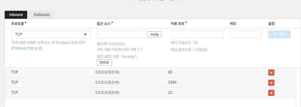 접근제어와 같은 것 → 디폴트로 생성되어 있는 것을 추가한다.(Default ACG 사용)