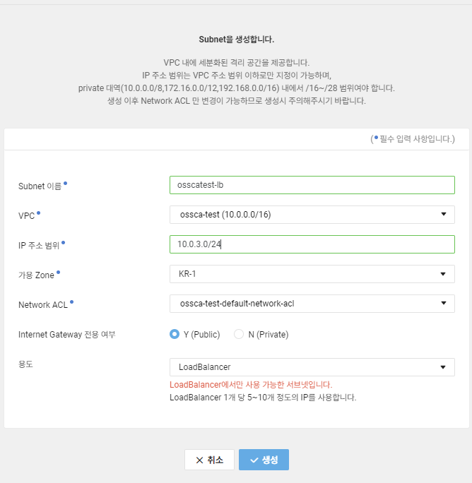 로드밸런서 생성을 위해 로드밸런서 전용 서브넷을 만들어 주어야 한다.