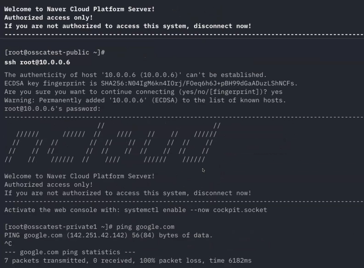 - Public 서버에 접속한 뒤 위와 같이 private 서버를 접속하면 private 서버를 접속하는 것 또한 가능하다.